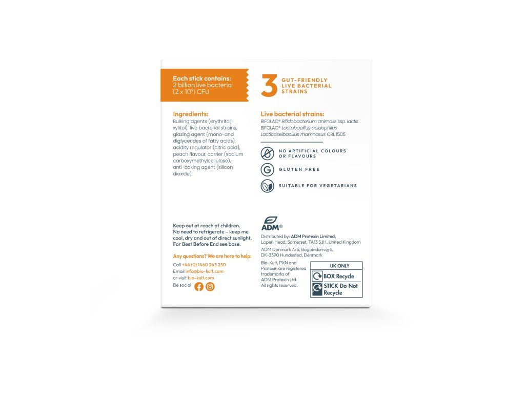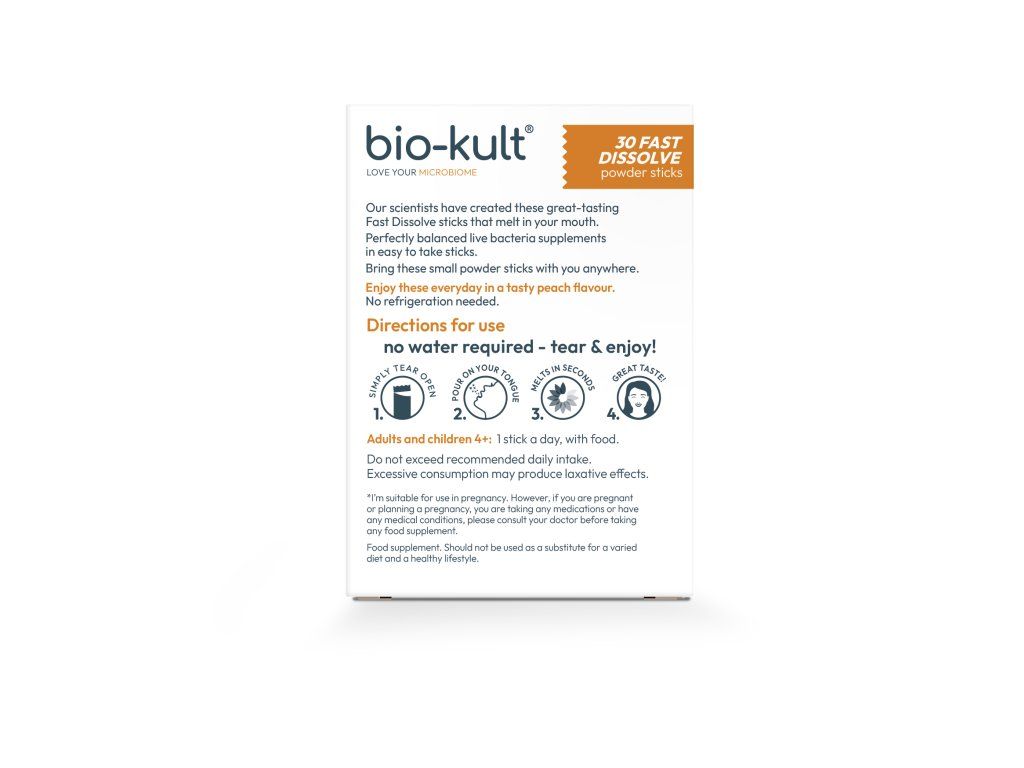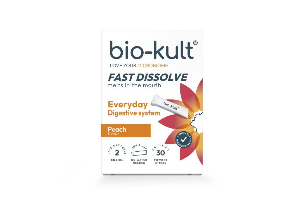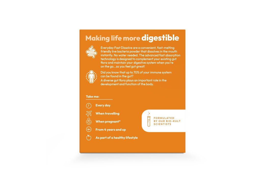 Všichni máme ve střevech stovky různých bakteriálních kmenů, z nichž každý hraje důležitou roli v udržování celkového zdraví a pohody. Ve skutečnosti se 70% našeho imunitního systému nachází ve střevech. Každý sáček Bio-Kult Everyday Fast Dissolve pro trávicí systém, vyvinutý vědci z Bio-Kultu, jako dokonale vyvážený doplněk stravy s probiotickými bakteriemi, obsahuje 2 miliardy živých probiotických bakterií ze tří vědecky prozkoumaných kmenů, které jsou šetrné ke střevům a doplňují váš stávající střevní mikrobiom a pomáhají vám cítít se skvěle.